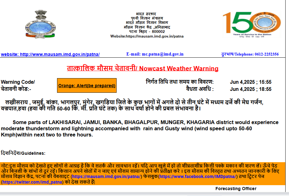 Bihar Rain Alert: पटना मौसम विज्ञान केंद्र ने बिहार के लखीसराय, जमुई, बांका, बांका, भागलपुर, मुंगेर, खगड़िया जिले के कुछ कुछ भागों में अगले दो से तीन घंटे वज्रपात, हवा (हवा की गति 50-60 कि. मी. प्रति घंटे तक) के साथ वर्षा होने की चेतावनी जारी की है.