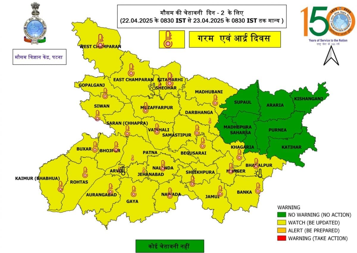 पटना स्थित मौसम विज्ञान केंद्र ने 22 अप्रैल को प्रदेश के 31 जिलों में हॉट डे और उमस भरी गर्मी को लेकर येलो अलर्ट जारी किया है. इस हफ्ते के लिए हीट वेव, हॉट नाइट और हॉट डे की संभावना जताई गई है. विशेषज्ञों ने लोगों को विशेष सतर्कता बरतने की सलाह दी है, खासकर दोपहर 12 बजे से शाम 4 बजे के बीच घर से बाहर निकलने से परहेज करने की हिदायत दी गई है.