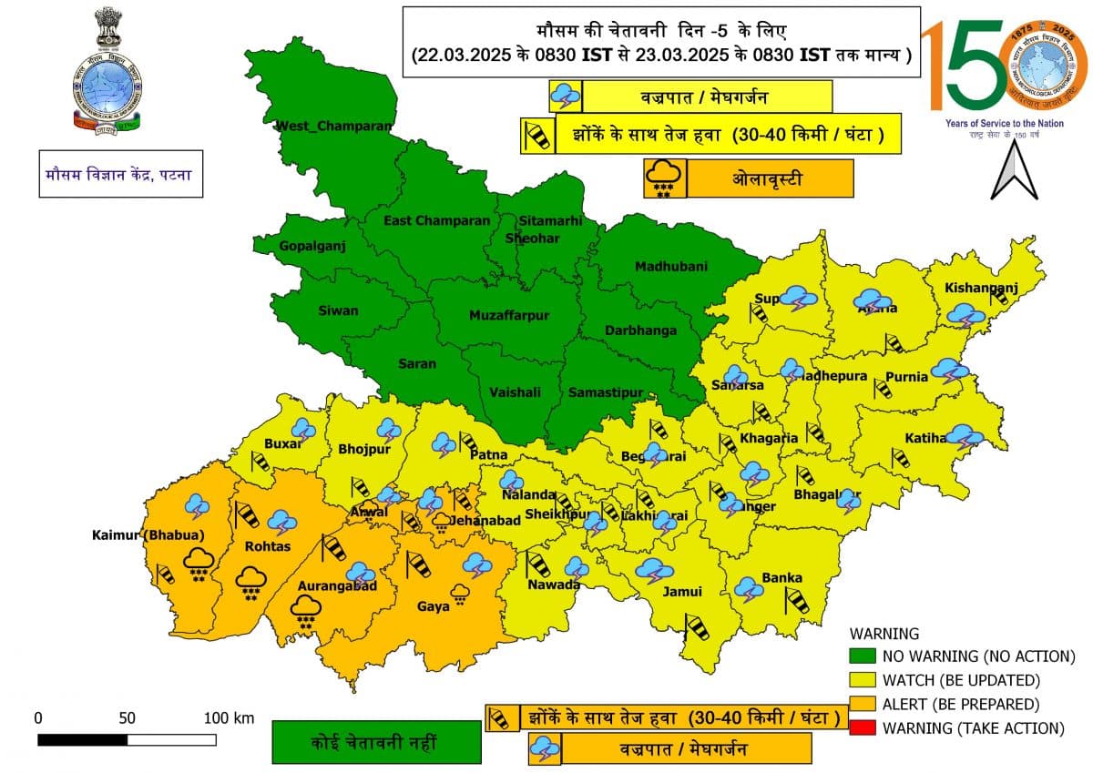 मौसम विभाग द्वारा 22 से 23 मार्च के लिए जारी पूर्वानुमान में मंगलवार बताया गया कि यहां के रोहतास, कैमूर, बक्सर, भोजपुर, पटना, जहानाबाद, नालंदा, शेखपुरा, लखीसराय, मुंगेर, भागलपुर, कटिहार, पूर्णिया, खगड़िया, मधेपुरा, सुपौल, अररिया, किशनगंज, पूर्णिया, अरवल, औरंगाबाद, गया, नवादा, जमुई और बांका में 30 से 40 किमी प्रति घंटे की रफ्तार से हवा चलने के साथ बारिश होने की प्रबल संभावना है. इसे लेकर येलो अलर्ट जारी किया गया है.