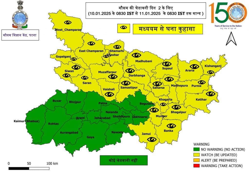 आइएमडी ने बिहार के 24 जिलों के लिए 11 जनवरी तक मध्यम से घना कुहासा छाए रहने को लेकर अलर्ट जारी किया है. इन जिलों में पश्चिम चंपारण, पूर्वी चंपारण, शिवहर, सीतामढ़ी, गोपालगंज, सीवान, सारण, मुजफ्फरपुर, वैशाली, मधुबनी, दरभंगा, समस्तीपुर, सुपौल, अररिया, किशनगंज, पूर्णिया, मधेपुरा, कटिहार, सहरसा, खगड़िया, भागलपुर, बांका, मुंगेर और जमुई शामिल है.