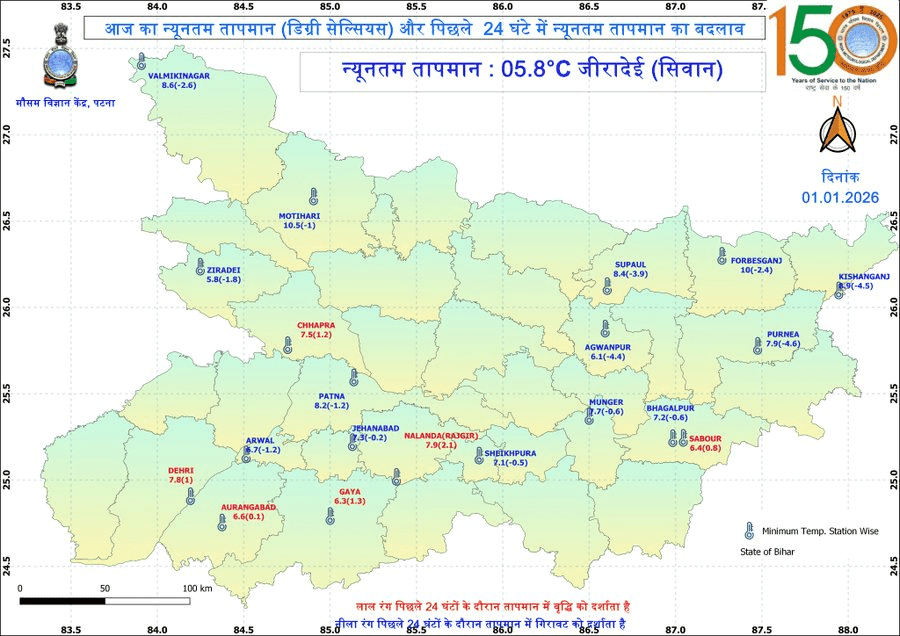 पूर्वी और दक्षिण-पूर्वी बिहार के मुंगेर, भागलपुर, बांका और जमुई में भी ठंड का असर देखा जा रहा है और इन्हें सतर्क रहने की सलाह दी गई है. मौसम रिपोर्ट के अनुसार राज्य का न्यूनतम तापमान सीवान में लगभग 5.8 डिग्री सेल्सियस दर्ज किया गया है.