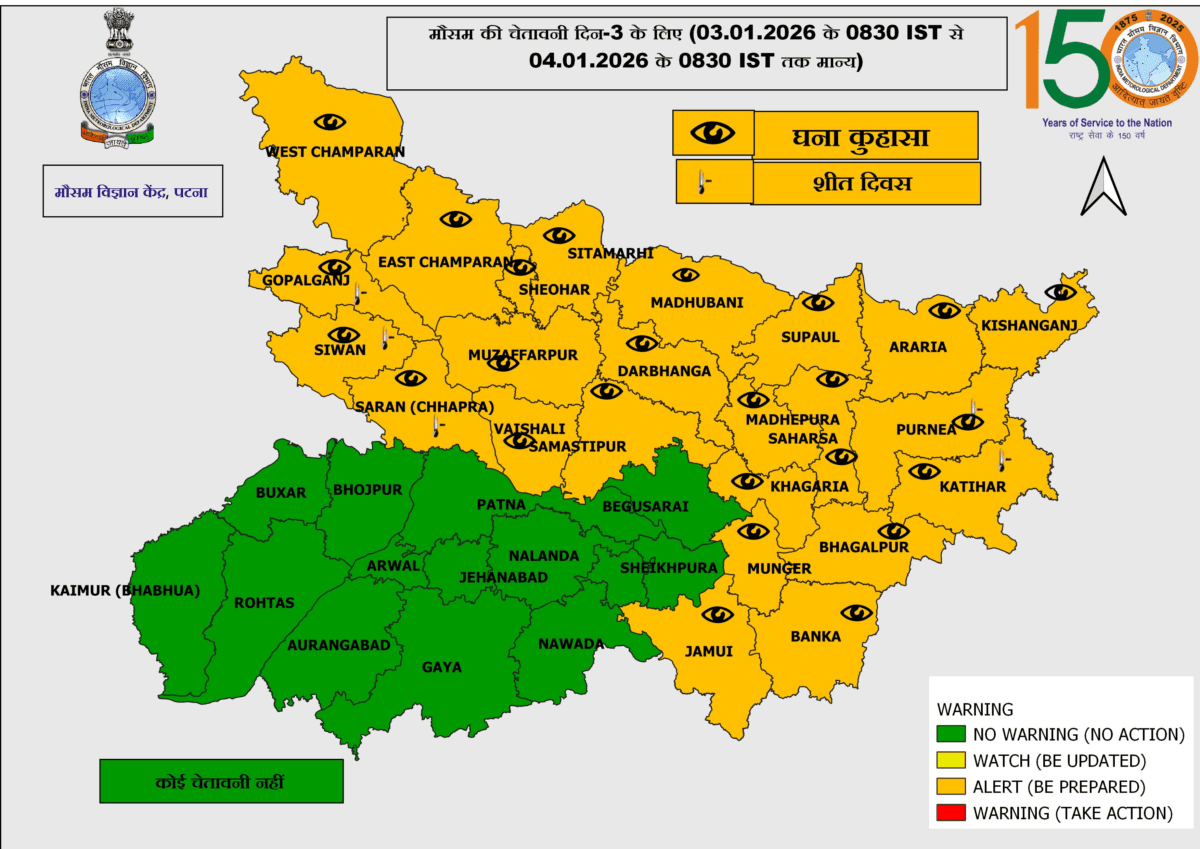 IMD Patna Alert: मौसम विज्ञान केंद्र पटना द्वारा जारी पूर्वानुमान में बताया गया है कि बिहार में कड़ाके की ठंड का असर लगातार बना हुआ है. 3 जनवरी से 4 जनवरी तक के लिए जारी मौसम चेतावनी में बताया गया है कि अधिकांश जिलों में घना कोहरा और शीत दिवस की स्थिति बनी रहने की संभावना है. इससे आम जनजीवन, यातायात और स्वास्थ्य पर प्रभाव पड़ सकता है.