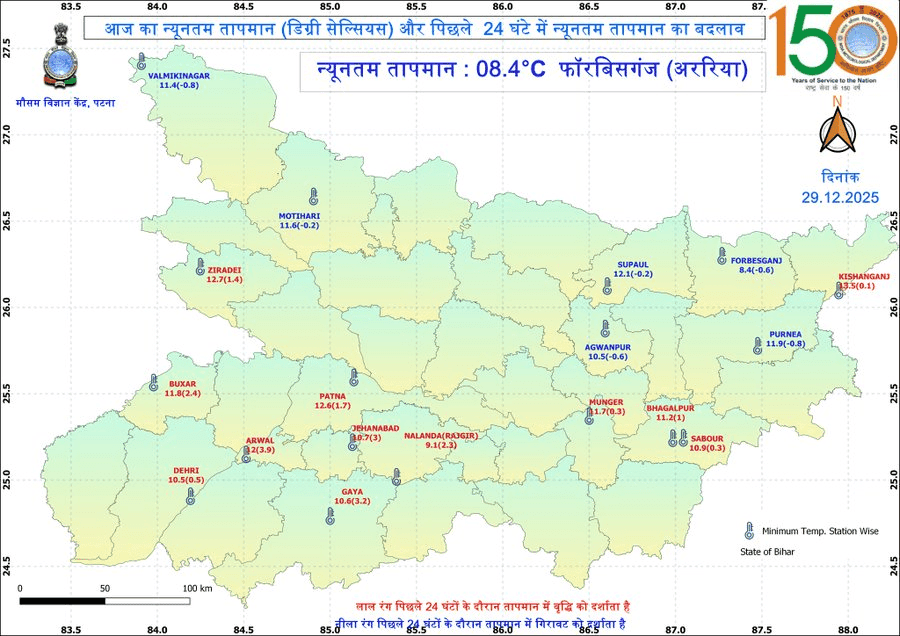 बीते 24 घंटों में राज्य के कई हिस्सों में न्यूनतम तापमान गिरा है. अररिया जिले के फारबिसगंज में सबसे कम तापमान 8.4 डिग्री सेल्सियस दर्ज किया गया. पटना, गया, नालंदा और भागलपुर जैसे जिलों में तापमान 9 से 13 डिग्री सेल्सियस के बीच बना हुआ है.