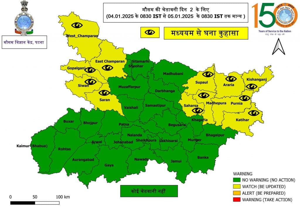 मौसम विज्ञान केंद्र पटना ने अपने अपडेट में पश्चिम चंपारण, पूर्वी चंपारण, गोपालगंज, सिवान, सारण, सुपौल, अररिया, किशनगंज, मधेपुरा, सहरसा, पूर्णिया और कटिहार के लिए अलर्ट जारी किया है. मौसम में हो रहे लगातार बदलाव की वजह से हाईवे सहित विभिन्न मार्गां पर वाहनों की रफ्तार धीमी हो गई है. लोग लाइट जलाकर गाड़ी चलने को मजबूर है. तापमान में भी गिरावट की वजह से कनकनी बढ़ गई है.
