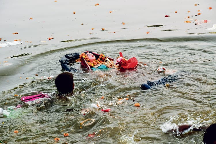 घाटों पर बने विशेष गड्ढ़े में उतरवाया जा रहा था प्लास्टिक का सजावटी सामान विसर्जन के लिए बने अस्थायी तालाब घाटों पर तैनात नगर निगम के कर्मी विसर्जन के लिए लायी गयी प्रतिमाओं को सजाने में इस्तेमाल किये गये प्लास्टिक के सामान, चुनरी आदि को विसर्जन से पहले घाटों पर बने विशेष गड्ढ़े में उतार कर विसर्जित करने के लिए पूजा समितियों के लोगों को कह रहे थे. पाटीपुल, शिवा और जनार्दन जैसे घाटों पर भी जहां अस्थायी तालाब का निर्माण नहीं किया गया है और बड़ी मूर्तियों के विसर्जन पर रोक है, वहां भी ऐसे गड्ढ़े बनाये गये हैं ताकि छोटी प्रतिमाओं का विसर्जन करने वाले लोगों से भी विसर्जन से पहले प्लास्टिक का सामान अलग करवाया जा सके. पाटलिपुत्रा अंचल के कार्यपालक पदाधिकारी पुण्य तरु ने बताया कि इससे प्लास्टिक के सामान को नदी में प्रवाहित करने से रोकने ओर उनको अलग से एकत्रित कर डिस्पोज करने में सुविधा होगी. इसके साथ ही जेटिंग मशीन के माध्यम से गंगा घाट एवं सीढ़ियों की सफाई की जा रही है.ट्रैश स्कीमर से हो रही मंगल तालाब की सफाई