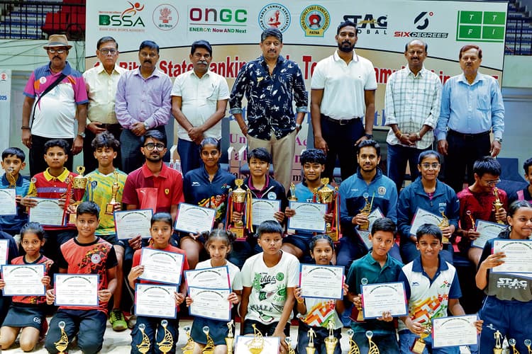 खेल संवाददाता, पटना : पाटलिपुत्र खेल परिसर में खेल विभाग, बिहार राज्य खेल प्राधिकरण और बिहार टेबल टेनिस एसोसिएशन के संयुक्त तत्वावधान में आयोजित फर्स्ट बिहार स्टेट रैंकिंग टेबल टेनिस टूर्नामेंट में पटना कुमारी अनन्या ने शानदार प्रदर्शन करते हुए तीन स्वर्ण और एक रजत पदक जीत कर टूर्नामेंट की सर्वश्रेष्ठ खिलाड़ी बनी़ बिहार राज्य खेल प्राधिकरण के महानिदेशक रवींद्रण शंकरण, निदेशक रविंद्र नाथ चौधरी, अंतरराष्ट्रीय टेबल टेनिस खिलाड़ी पद्मश्री शरथ कमल, अर्जुन पुरस्कार से सम्मानित सौम्यदीप रॉय और पौलोमी घटक ने विजेता खिलाडियों को ट्रॉफी और मेडल देकर सम्मानित किया. हर आयु वर्ग में प्रथम स्थान पाने वाले को पांच हजार, द्वितीय स्थान पर आने वाले को तीन हजार और तृतीय स्थान पर पाने वाले को एक हजार रुपये का नकद पुरस्कार दिया गया. सभी प्रतिभागियों को सर्टिफिकेट दिया गया है. अंडर-11, 13, 15, 17, 19 बॉयज, गर्ल्स सिंगल और मेंस, वीमेंस सिंगल की इस प्रतियोगिता में बिहार के 17 जिलों से 250 से ज्यादा खिलाड़ियाें ने हिस्सा लिया. अंडर-15 बालक वर्ग में पटना के आयुष मिश्रा पहले, पटना के विराट नारायण दूसरे और सहरसा के हिमांशु कुमार और पटना के ईशान शर्मा तीसरे स्थान पर रहे. बलिका वर्ग में मुजफ्फरपुर की निलांजना शर्मा को पहला, पटना की कुमारी अनन्या को दूसरा, पटना की तेजस्वी तेजश्री और नव्या लक्ष्मी को तीसरा स्थान हासिल हुआ. अंडर- 17 बालक वर्ग में पटना के कुमार दिव्यदर्श को पहला, पटना के एकलव्य शर्मा को दूसरा, पटना के ही आयुष मिश्रा और ऋशिक स्वराज को तीसरा स्थान मिला. बालिका वर्ग में पटना की कुमारी अनन्या पहले, पटना की नव्या लक्ष्मी को दूसरा, पटना की नूपुर बनर्जी को तीसरा स्थान मिला. अंडर-19 बालिका वर्ग में पटना की कुमारी अनन्या पहले स्थान पर रही. दूसरे स्थान पर पटना की नव्या लक्ष्मी और तीसरे स्थान पर भी पटना माही गुप्ता और नूपुर बनर्जी. अंडर-19 बालक वर्ग में पटना के कुमार हर्षित ने पहला स्थान हासिल किया. मुजफ्फरपुर के कविश साहू दूसरे स्थान पर रहे. पटना के एकलव्य शर्मा व कुमार दिव्यदर्श को तीसरा स्थान हासिल हुआ. महिला एकल वर्ग में पटना की कुमारी अनन्या विजेता बनी. मधेपुरा की रिंयाशी गुप्ता उपविजेता बनी. पटना की फाल्गुनी मुखर्जी और मुजफ्फरपुर की नीलांजना शर्मा तीसरे स्थान पर रही. पुरुष एकल वर्ग में पटना के कुमार हर्षित ने खिताब जीता. मुजफ्फरपुर के कविश साहू उपविजेता बने. पटना के किशन राज और पीयूष दिलीप गांधी को तीसरा स्थान हासिल हुआ