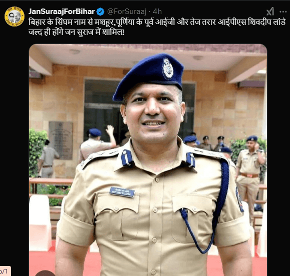 सोशल मीडिया पर एक पोस्ट किया गया है जिसमें लिखा है कि शिवदीप लांडे जनसुराज में शामिल होंगे. जिसके बाद शिवदीप लांडे के राजनीति में आने की चर्चा तेज हो गई है.