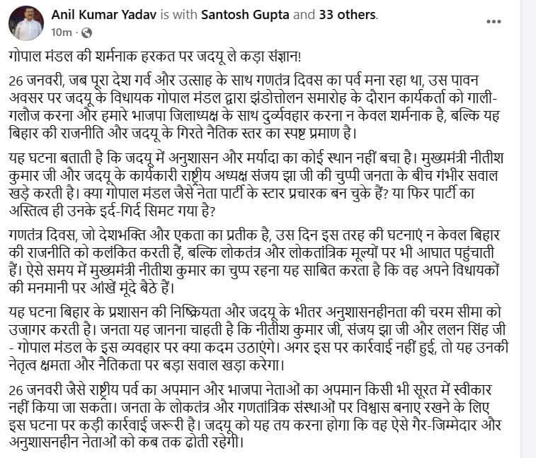 अनिल कुमार यादव ने आगे फेसबुक पोस्ट में लिखा- ‘ यह घटना बताती है कि जदयू में अनुशासन और मर्यादा का कोई स्थान नहीं बचा है. मुख्यमंत्री नीतीश कुमार जी और जदयू के कार्यकारी राष्ट्रीय अध्यक्ष संजय झा जी की चुप्पी जनता के बीच गंभीर सवाल खड़े करती है. क्या गोपाल मंडल जैसे नेता पार्टी के स्टार प्रचारक बन चुके हैं? या फिर पार्टी का अस्तित्व ही उनके इर्द-गिर्द सिमट गया है?’ बता दें कि पूर्व में गणतंत्र दिवस पर गोपाल मंडल और अनिल कुमार यादव के बीच भी विवाद हो चुका है. ‘