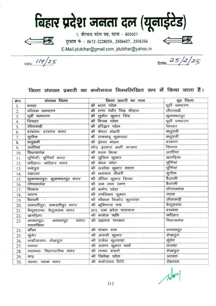 घोषणा के साथ ही सभी 38 जिलों में पार्टी को अब संगठन प्रभारी मिल गए हैं. सूची के मुताबिक, मनोरंजन गिरि को पटना की जिम्मेदारी सौंपी गई है. बगहा की जिम्मेदारी भरत पटेल को दी गई है, जबकि पश्चिमी चंपारण का प्रभारी राणा रणधीर सिंह चौहान को बनाया गया है. पूर्वी चंपारण का प्रभारी सुबोध कुमार सिंह को, शिवहर का दीपक पटेल को, सीतामढ़ी का हरिद्वार पटेल को, दरभंगा का केदार भंडारी, सुपौल का रामबाबू कुशवाहा, मधुबनी का ईश्वर मंडल तथा अररिया का प्रभारी मोहम्मद इरशाद अली आजाद को बनाया गया है.