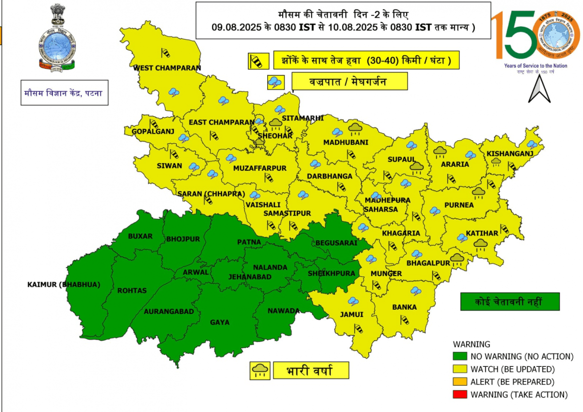 Kal Ka Mausam: बिहार के कई जिलों में रुक-रुककर बारिश हो रही है. इस बीच 9 अगस्त को बिहार के 9 जिलों में भयंकर बारिश की चेतावनी जारी की गई है. मौसम विभाग की ओर से इन जिलों के अलावा अन्य जिलों में वज्रपात और मेघगर्जन को लेकर भी अलर्ट जारी किया गया है.