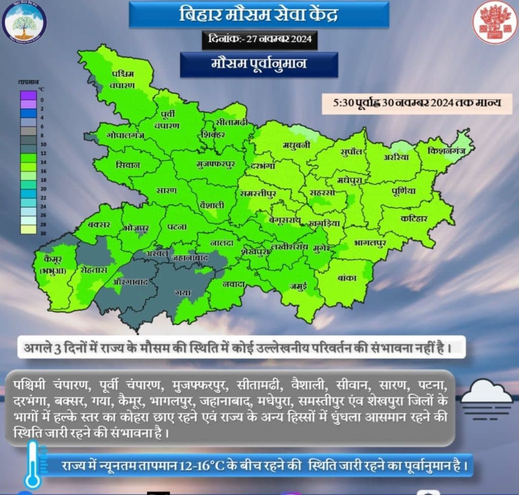 मौसम विज्ञान केंद्र पटना के अनुसार पर्वतीय इलाकों में पश्चिमी विक्षोभ का प्रभाव बनने से प्रदेश के मौसम में बदलाव आएगा. अगले 24 घंटों के दौरान पटना सहित अधिसंख्य भागों में सुबह के समय धुंध व उत्तरी भागों में घना कोहरे का प्रभाव रहेगा. गुरुवार को पटना सहित आसपास इलाकों में सुबह के समय धुंध व दिन में धूप निकलने से मौसम सामान्य बना रहा. शाम होते ही मंद पछुआ हवाओं के कारण लोगों को ठंडक का अहसास होगा. वहीं 30 नवंबर से शुष्क पछुआ हवाओं के असर के कारण दिन और रात के तापमान में तेजी से कमी आएगी.