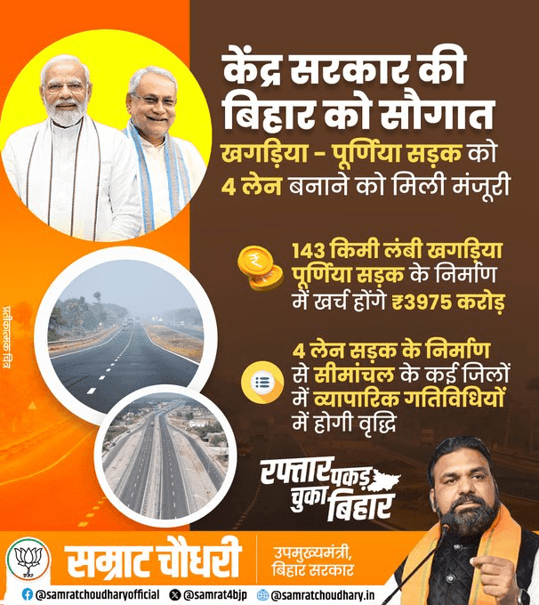 सम्राट चौधरी ने इस परियोजना को राज्य के विकास के लिए बहुत जरूरी बताया है. X पर पोस्ट में उन्होंने बताया कि यह सड़क सीमांचल के विकास में नई रफ्तार लाएगी. केंद्र सरकार की मंजूरी के बाद लोग उम्मीद कर रहे हैं कि सड़क का काम जल्द शुरू होगा.
