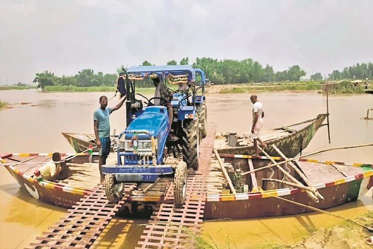 कोसी नदी ट्रैक्टर पर नाव ले जाते तो देखा जाता है, पर नाव पर ट्रैक्टर ले जाते देखना बाढ़ प्रभावित इलाकों में ही संभव है. बाढ़ प्रभावित कुशेश्वरस्थान पूर्वी के चौकियां, उसरी, जिमराहा, विशुनिया में यह दृश्य आम है. यहां के लोगों को दैनिक कार्य समेत शादी व भोज कार्य के लिए सामान की खरीदारी कर कुशेश्वरस्थान बाजार से कमला बलान तटबंध तक गाड़ी से सामान लाना होता है. फिर तटबंध से घर तक जाने के लिए नाव पर ट्रैक्टर चढ़ाकर कोसी नदी पार कराया जाता है. दो नावों को जोड़ कर उसपर चार चक्का वाहन या ट्रैक्टर चढ़ाकर नदी पार किया जाता है.