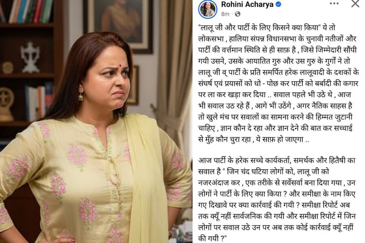 बिहार विधानसभा चुनावों से ठीक पहले रोहिणी आचार्य के तीखे तेवरों ने विरोधियों (JDU-BJP) को बैठे-बिठाए बड़ा मुद्दा दे दिया था। सियासी गलियारों में चर्चा है कि क्या तेजस्वी यादव अपनी बहन के इन गंभीर आरोपों का जवाब देंगे, या फिर ‘आयातित गुरुओं’ की सलाह पर चुप्पी साधे रखेंगे? बहरहाल, लालू परिवार में ‘आयातित गुरु’ की वजह से Family Conflict है। रोहिणी के इस पोस्ट के बाद पटना से लेकर दिल्ली तक आरजेडी खेमे में सन्नाटा है। अब देखने वाली बात ये है कि क्या यह लालू परिवार के भीतर ‘सत्ता संघर्ष’ की नई शुरुआत है? या केवल बर्बाद होती पार्टी को बचाने की रोहिणी आचार्य की जंग!