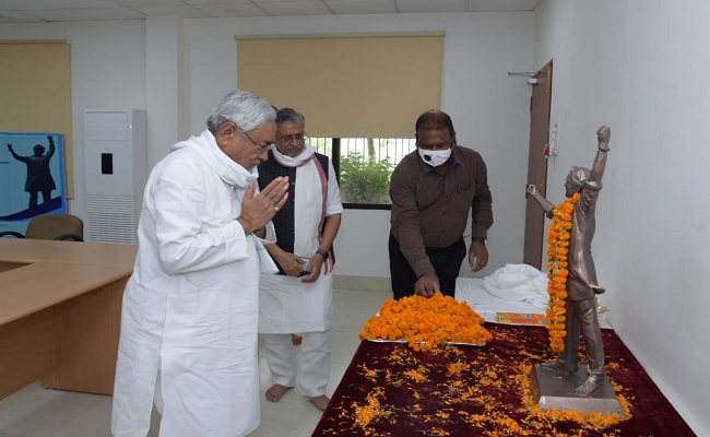 पटना : बिहार के मुख्यमंत्री नीतीश कुमार ने बुधवार को 1 अण्णे मार्ग स्थित नेक संवाद से स्व. जॉर्ज फर्नाडिस की जयंती के अवसर पर सिटी पार्क मुजफ्फरपुर में अधिष्ठापित उनकी आदमकद प्रतिमा का अनावरण वीडियो कांफ्रेसिंग के माध्यम से किया. अनावरण के पश्चात मुख्यमंत्री नीतीश कुमार ने जॉर्ज फर्नाडिस की प्रतिमा पर माल्यार्पण कर अपनी श्रद्धांजलि अर्पित की.