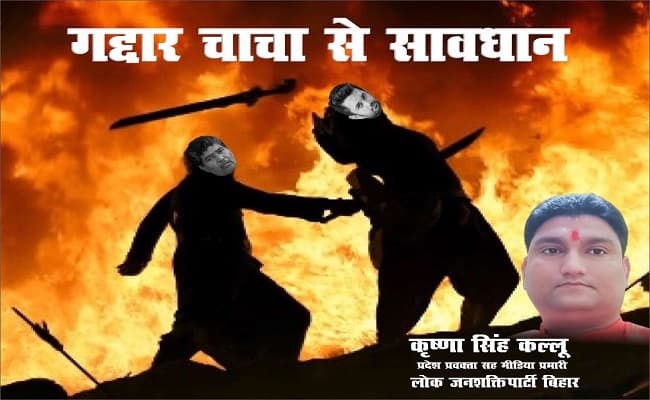 पटना के सड़क किनारे कटप्पा और बाहुबली के पोस्टर चिराग खेमे के द्वारा लगाए जाने की बात कही जा रही है. इसपर चिराग खेमें में रहे लोजपा के प्रदेश प्रवक्ता सह मीडिया प्रभारी की फोटो भी लगी है. इसके जरिये चिराग के पीठ पर खंजर भोंकने जैसे संदेश दिये जा रहे हैं.वहीं पारस गुट ने अब पार्टी के पोस्टर से चिराग को आउट कर दिया है.