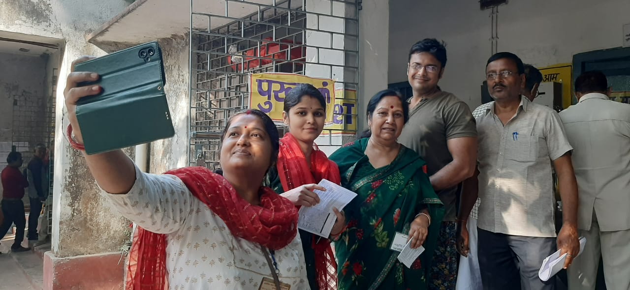 मतदान केंद्र संख्या 72 टैक्सी स्टैंड जिला शिक्षा पदाधिकारी कार्यालय पर सेल्फी लेती महिलाएं.