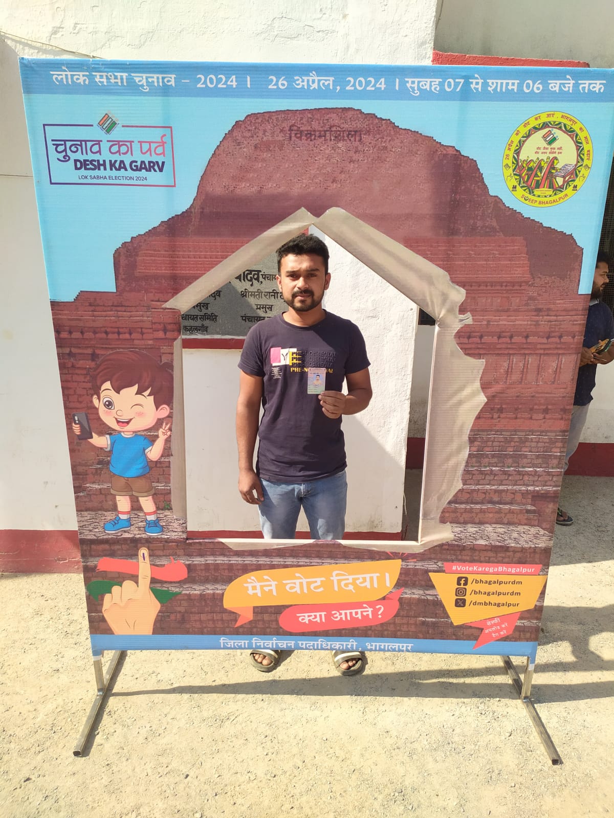 कहलगांव के बूथ संख्या 170 पर मतदान करने के बाद 85 वर्षीय उमेश मिश्र अपने बेटे के साथ मतदान चिह्न दिखाते हुए. मतदान के बाद उन्होंने कहा कि मैं वोट डालने के लिए भागलपुर से कहलगांव आया हूं. मैं अपना वोट डालकर बहुत खुश हूं’ जिसका भी नाम वोटर लिस्ट में है उसे वोट जरूर डालना चाहिए।