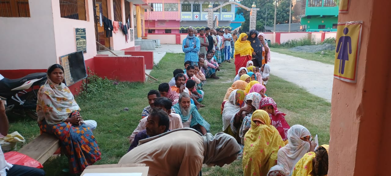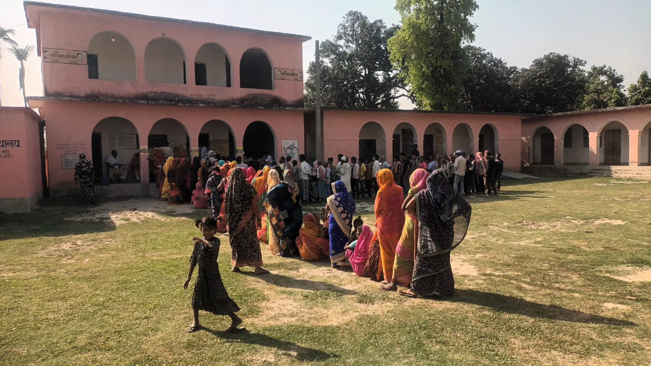बांका : कटोरिया के कन्या मध्य विद्यालय बूथ संख्या 72 पर मतदाताओं की लगी लंबी कतार.