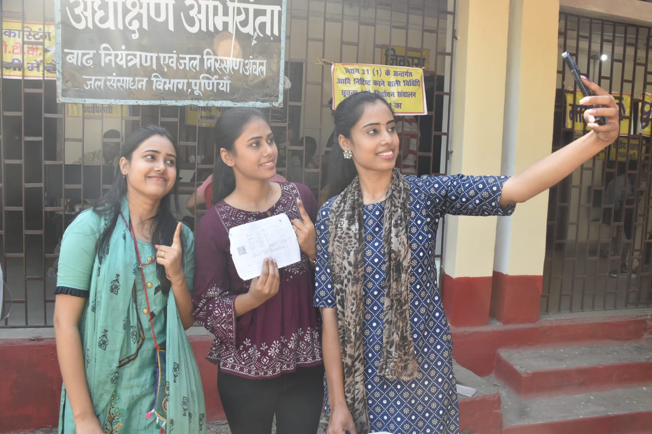 पूर्णिया के महानंदा कॉलोंनी बूथ संख्या 56 पर वोट देने के बाद सेल्फी लेती युवती.