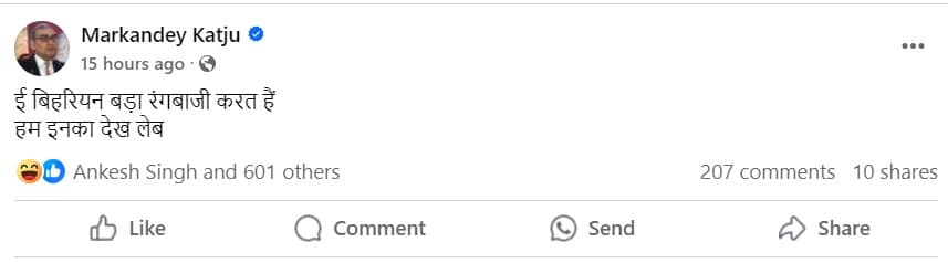 मार्कंडेय काटजू बिहार पर टिप्पणी करके पहले भी विवादों में घिर चुके हैं. कई साल पहले उन्होंने बिहार पर कुछ टिप्पणी की थी और इसका विरोध जोर पर हुआ तो उन्हें माफी मांगनी पड़ी थी. वहीं मार्कंडेय काटजू ने एकबार फिर से बिहार को लेकर लिखा है. मंगलवार को किए अपने एक फेसबुक पोस्ट पर उन्होंने लिखा कि ‘ई बिहरियन बड़ा रंगबाजी करत है… हम इनका देख लेब’. वहीं काटजू के इस पोस्ट पर ताबड़तोड़ रिएक्शन आने शुरू हो गए.