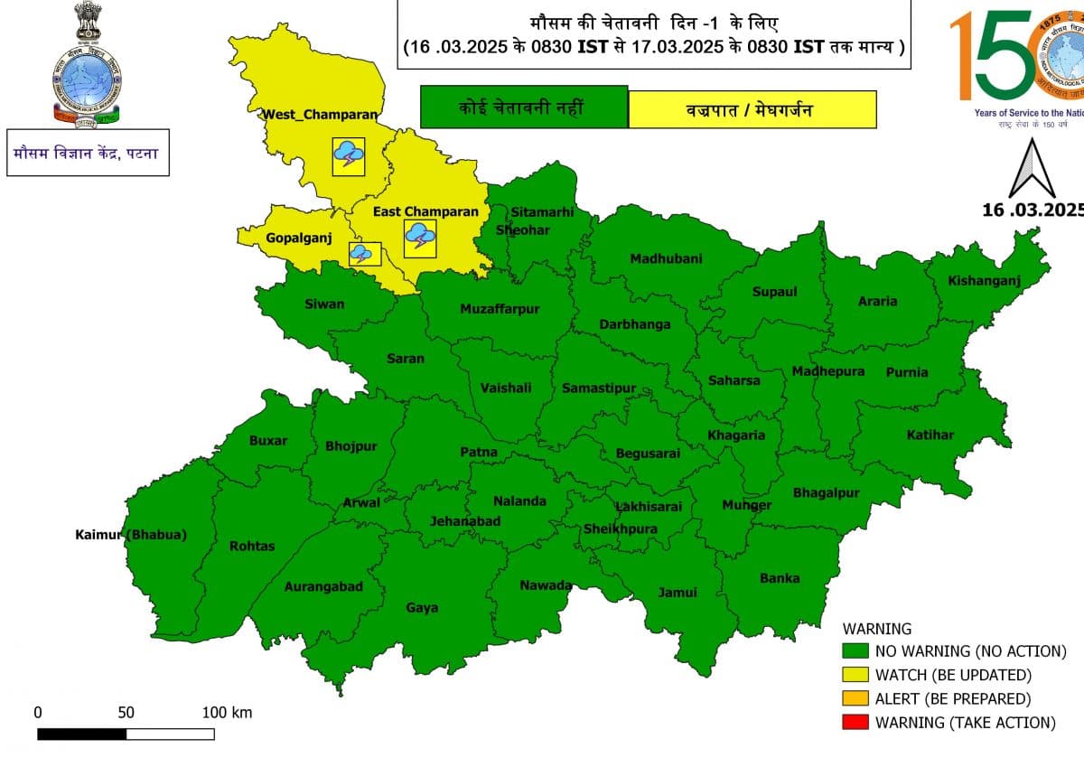 मौसम विभाग के अनुसार मोतिहारी, बेतिया और गोपालगंज में 16 और 17 मार्च को तेज बारिश और मेघगर्जन की संभावना है. इसके चलते आसपास के जिलों में भी सुबह और शाम के समय हल्की ठंडक का एहसास होगा. पटना मौसम विज्ञान केंद्र ने इसे लेकर येलो अलर्ट जारी किया है.