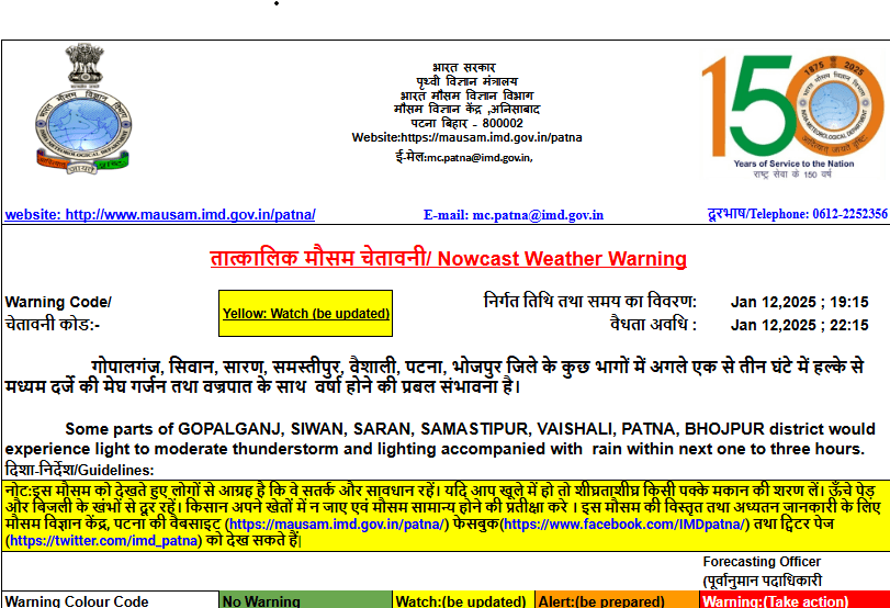 पटना मौसम विज्ञान केंद्र ने बिहार के 31 जिलों के लिए 13 जनवरी को मध्यम से घना कुहासा छाए रहने को लेकर अलर्ट जारी किया है. इन जिलों में पश्चिम चंपारण, पूर्णिया, मधेपुरा, कटिहार, सहरसा, खगड़िया, पूर्वी चंपारण, शिवहर, सीतामढ़ी, गोपालगंज, सीवान, सारण, मुजफ्फरपुर, वैशाली, मधुबनी, दरभंगा, समस्तीपुर, सुपौल, अररिया, किशनगंज, भागलपुर, बांका, मुंगेर और जमुई शामिल है.