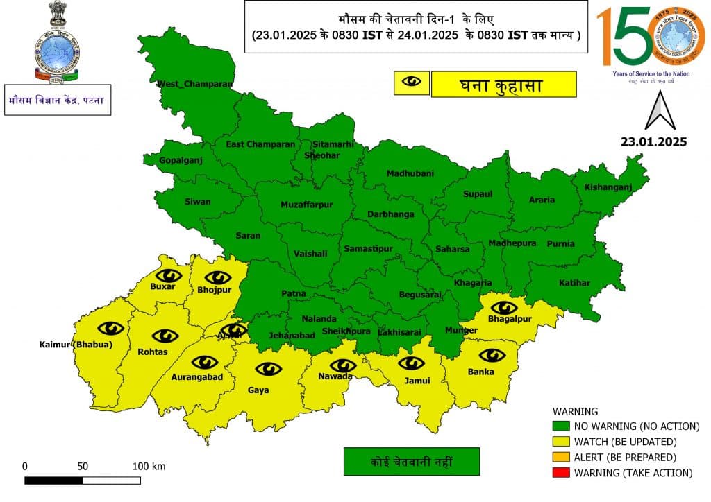 बिहार के वातावरण में वेस्टर्न डिस्टर्बेंस से उत्पन्न हुई नमी की मात्रा अचानक बढ़ गयी है. इससे बने कोहरे राज्य के अधिकतर हिस्से को अपने दायरे ले सकता है. इससे 11 जगहों पर कोल्ड-डे की स्थिति बनी रहेगी. अगले 24 घंटों तक राज्य के अधिकतर हिस्से विशेषकर हिमालय की तराई से सटे क्षेत्र में अति घने और शेष हिस्से में घना कोहरा छा जाने का पूर्वानुमान है. आइएमडी ने कोहरे के मद्देनजर 24 जनवरी के लिए येलो अलर्ट जारी किया है.