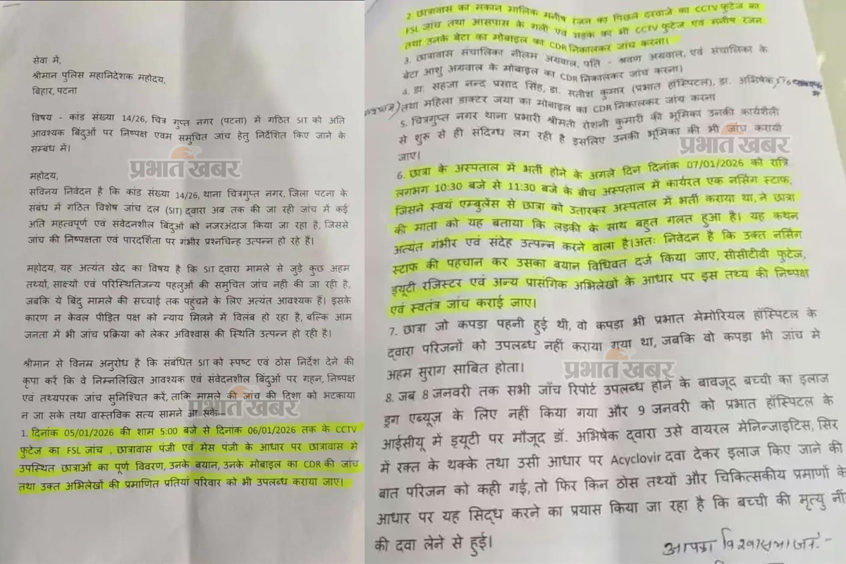 नीट छात्रा की मौत ने पूरे प्रदेश को आक्रोशित कर दिया है. DGP को भेजी गई यह 8 बिंदुओं वाली चिट्ठी अब सोशल मीडिया पर आग की तरह फैल रही है. लोग पूछ रहे हैं कि क्या बिहार में अब बेटियां हॉस्टल में भी सुरक्षित नहीं हैं? अब सबकी नजरें पुलिस मुख्यालय पर टिकी हैं. क्या DGP इस ‘साजिश’ की परतें खोलने को नए सिरे से आदेश देंगे, या फिर ये चिट्ठी भी सिस्टम की फाइलों में कहीं दफन हो जाएगी?