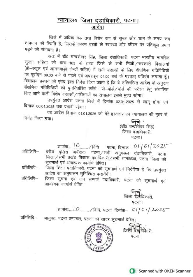 Patna News: बिहार में ठंड के कारण पटना डीएम ने स्कूल के संचालन को लेकर आदेश जारी किया है. डीएम के आदेश के अनुसार शाम 4:00 बजे के बाद स्कूल में पठन पाठन का काम नहीं होगा. पटना के डीएम डॉ चंद्रशेखर सिंह ने स्कूल संचालन के समय में बदलाव बिहार में ठंड को देखते हुए किया है. पटना के डीएम द्वारा इसको लेकर बुधवार की रात में आदेश जारी किया गया है. इस आदेश में कहा गया है कि जिले में ठंड का मौसम और कम तापमान विशेष रूप से सुबह और शाम के समय में जारी है. जिसके कारण बच्चों के स्वास्थ्य और जीवन पर प्रतिकूल प्रभाव पड़ने की संभावना है.