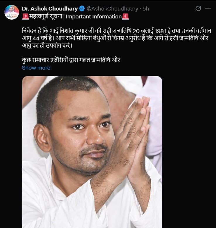 इस मामले को स्पष्ट करते हुए जदयू के वरिष्ठ नेता और मंत्री अशोक चौधरी ने स्थिति साफ कर दी है. उन्होंने सोशल मीडिया प्लेटफॉर्म एक्स पर पोस्ट कर बताया कि निशांत कुमार की जन्मतिथि को लेकर जो जानकारी सामने आ रही थी, वह पूरी तरह सही नहीं थी. उन्होंने मीडिया से अपील भी की कि सही जन्मतिथि और उम्र का ही इस्तेमाल किया जाए.