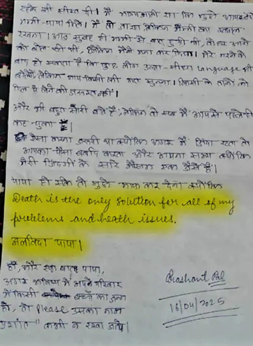 जीवन की तमाम उम्मीदों और सपनों के दबाव में टूटे प्रशांत ने सुसाइड नोट में लिखा, “मेरी सारी समस्या और बीमारी का समाधान मौत है.” दो पन्नों में उसने अपने दर्द को पापा के नाम खत में उड़ेल दिया, जिसमें कहा कि उसकी नींद, पढ़ाई और भविष्य सब इस बीमारी की वजह से बर्बाद हो चुके हैं.