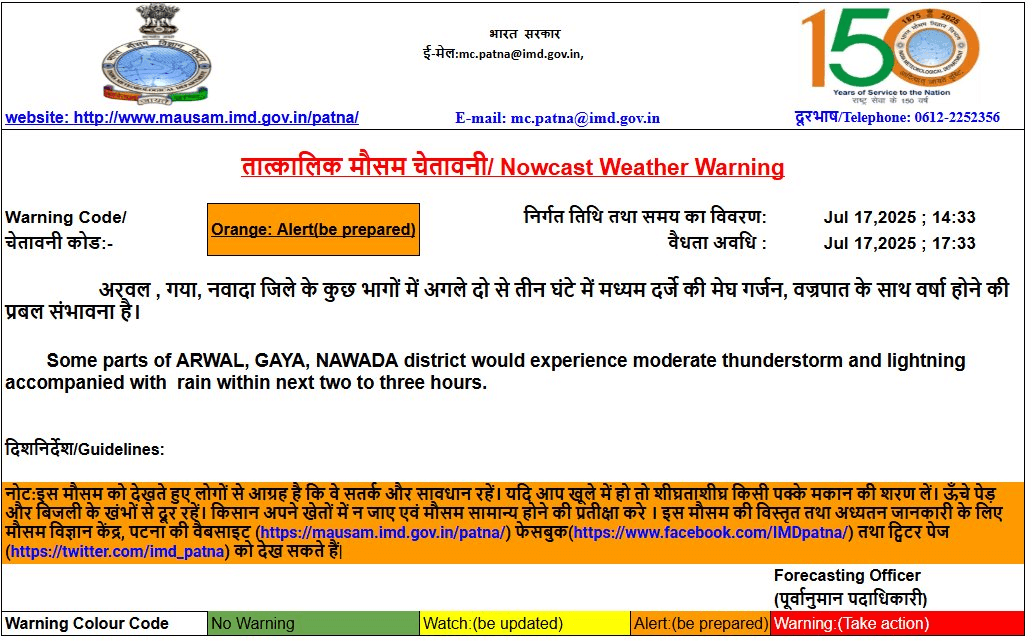 Nowcast Bihar: पटना मौसम विज्ञान केंद्र ने बताया कि बिहार के अरवल, गया, नवादा, पश्चिम चंपारण, मधेपुरा, पूर्णिया, कटिहार, गोपालगंज, सिवान, औरंगाबाद, गया, भागलपुर जिले के कुछ भागों में अगले दो से तीन घंटे में मध्यम दर्जे की मेघ गर्जन, वज्रपात के साथ वर्षा होने की संभावना है. इन जिलों में तेज आंधी चलने की भी संभावना है.