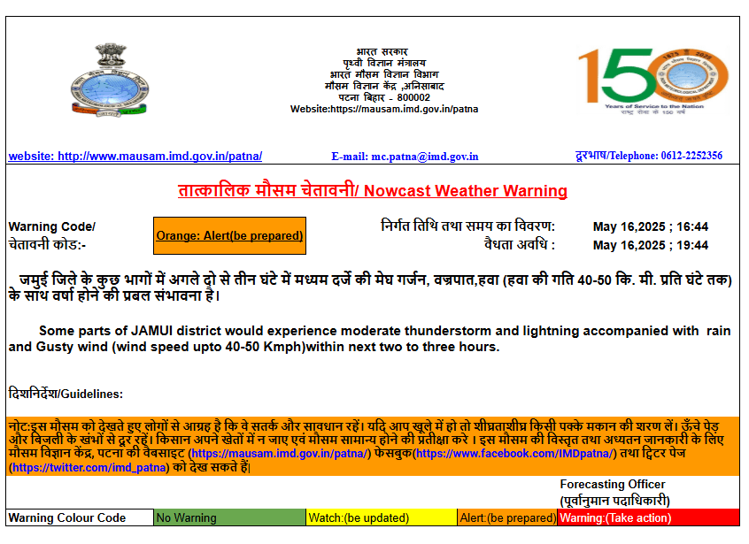 Nowcast Bihar: पटना मौसम विज्ञान केंद्र ने अगले 3 घंटे के दौरान बिहार के जमुई और गोपालगंज जिले में भारी बारिश की चेतावनी जारी की है. मौसम विभाग ने ऐसे मौसम को देखते हुए लोगों सावधान रहने को कहा है. यदि खुले में हो तो जल्द से जल्द किसी पक्के मकान में छिप जाएं. ऊंचे पेड़ और बिजली के खंभों से दूर रहें.