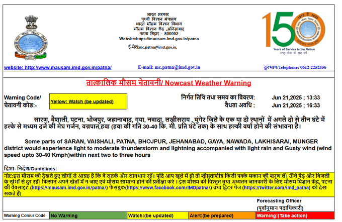 इन जिलों में ऑरेंज अलर्ट 21 जून को पटना मौसम विज्ञान केंद्र ने पश्चिम चंपारण, पूर्वी चंपारण, गोपालगंज, सीवान, सारण, भोजपुर, बक्सर, कैमूर, रोहतास, औरंगाबाद, अरवल, पटना, जहानाबाद, नालंदा, नवादा, शेखपुरा, लखीसराय, बेगूसराय, गया, खगड़िया, जमुई, मुंगेर, बांका और भागलपुर जिलों में तेज बारिश होने का अलर्ट जारी किया है. इन जिलों में ठनका गिरने की भी संभावना है. इन जिलों में ऑरेंज अलर्ट जारी किया गया है. बारिश के दौरान 50 किमी प्रति घंटे की गति से हवा चल सकती है.