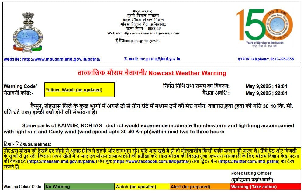 Nowcast Bihar: पटना मौसम विज्ञान केंद्र ने कैमुर, रोहतास जिले के कुछ भागों में अगले दो से तीन घंटे में मध्यम दर्जे की मेघ गर्जन, वज्रपात, हवा (हवा की गति 30-40 कि. मी. प्रति घंटे तक) हल्की वर्षा होने की संभावना जताई है. खराब मौसम को देखते हुए मौसम विभाग ने लोगों से आग्रह है कि वे सतर्क और सावधान रहें. खुले में हो तो जल्द से जल्द किसी पक्के मकान की शरण लें. ऊंचे पेड़ और बिजली के खंभों से से दूर रहें.