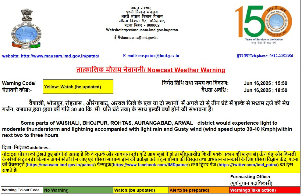 Nowcast Bihar: पटना मौसम विज्ञान केंद्र ने वैशाली, भोजपुर, रोहतास, औरंगाबाद, अर्वल जिले के एक या दो स्थानों में अगले दो से तीन घंटे में हल्के से मध्यम दर्जे की मेघ गर्जन, वज्रपात, हवा (हवा की गति 30-40 किमी प्रति घंटे तक) के साथ हल्की वर्षा होने की संभावना जताई है.