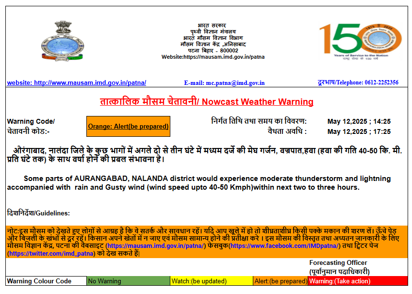 Nowcast Bihar: पटना मौसम विज्ञान केंद्र ने बिहार के औरंगाबाद, नालंदा जिले के कुछ भागों में अगले दो से तीन घंटे में मध्यम दर्जे की मेघ गर्जन, वज्रपात, हवा (हवा की गति 40-50 कि. मी. प्रति घंटे तक) के साथ वर्षा होने की प्रबल संभावना जताई है.