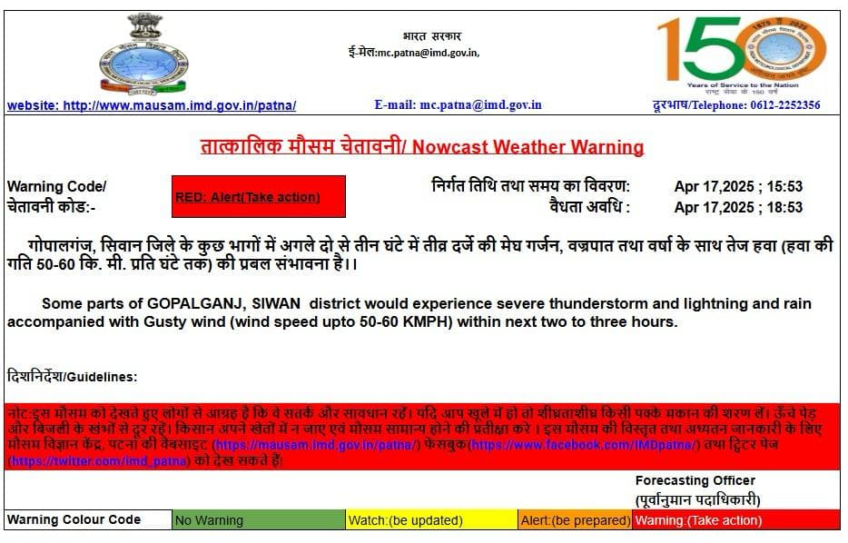 Nowcast Bihar: पटना मौसम विज्ञान केंद्र ने गोपालगंज और सिवान जिले के कुछ भागों में अगले दो से तीन घंटे में तीव्र दर्जे की मेघ गर्जन, वज्रपात तथा वर्षा के साथ तेज हवा (हवा की गति 50-60 कि. मी. प्रति घंटे तक) की संभावना जताई है. इसे लेकर रेड अलर्ट जारी हुआ है.