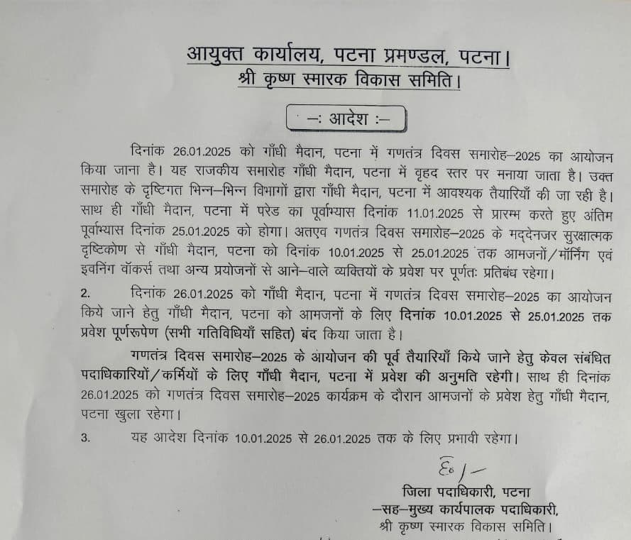 Patna Gandhi Maidan Closure: पटना में गणतंत्र दिवस के मद्देनजर गांधी मैदान को बंद करने का आदेश जारी किया गया है. जिला प्रशासन ने सुरक्षा व्यवस्था को ध्यान में रखते हुए यह कदम उठाया है. आदेश के मुताबिक, गांधी मैदान में किसी भी प्रकार की गतिविधि या जनसभा की अनुमति नहीं होगी. अधिकारियों ने यह सुनिश्चित करने के लिए कड़ी निगरानी रखने का निर्देश दिया है कि किसी भी असामाजिक तत्वों द्वारा माहौल बिगाड़ने की कोशिश न की जाए.