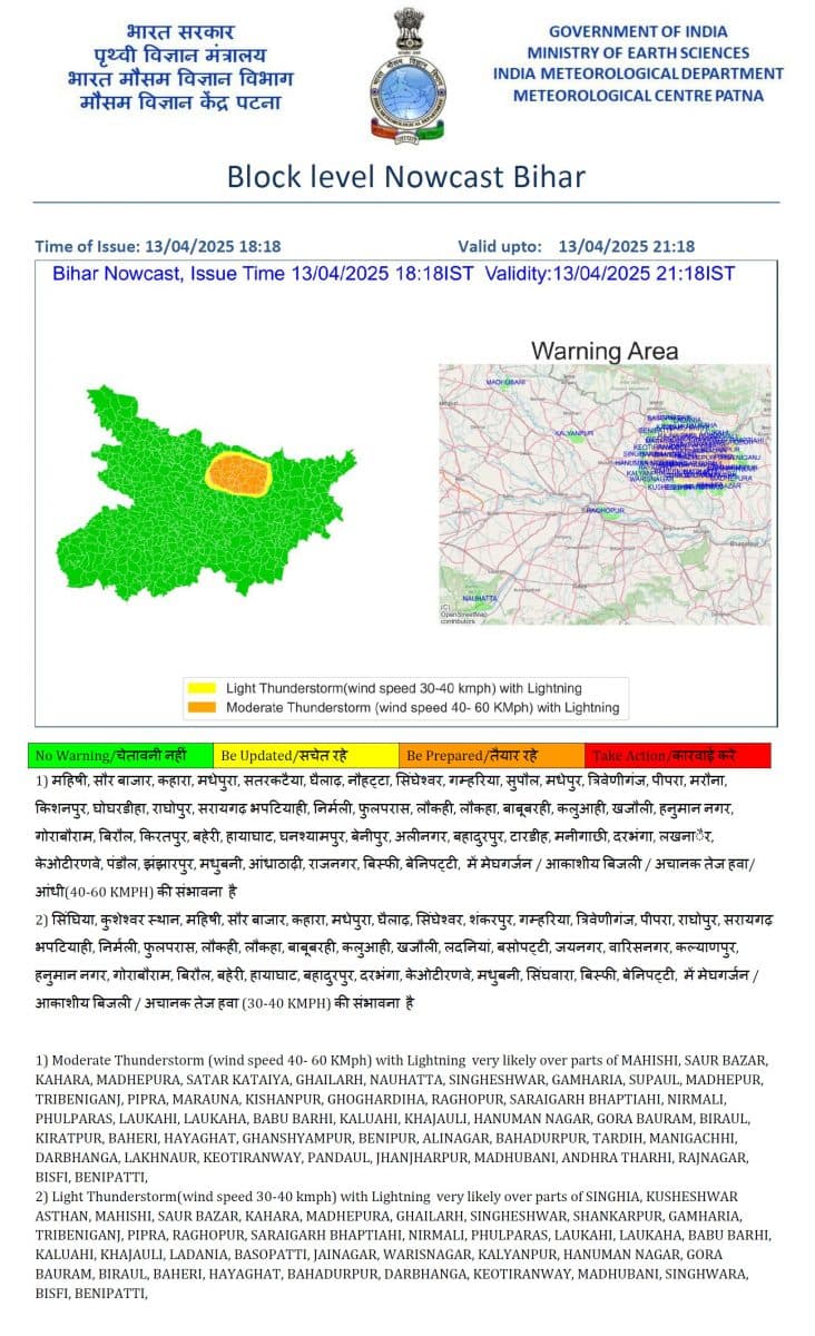 पटना मौसम विज्ञान केंद्र ने तात्कालिक चेतावनी में बताया कि सिंघिया, कुशेश्वर स्थान, महिषी, सौर बाजार, कहारा, मधेपुरा, घैलाढ़, सिंघेश्वर, शंकरपुर, गम्हरिया, त्रिवेणीगंज, पीपरा, राघोपुर, सरायगढ़ भपटियाही, निर्मली, फुलपरास, लौकही, लौकहा, बाबूबरही, कलुआही, खजौली, लदनियां, बसोपट्टी, जयनगर, वारिसनगर, कल्याणपुर, हनुमान नगर, गोराबौराम, बिरौल, बहेरी, हायाघाट, बहादुरपुर, दरभंगा, केओटीरणवे, मधुबनी, सिंघवारा, बिस्फी, बेनिपट्टी, में मेघगर्जन, आकाशीय बिजली, अचानक तेज हवा (30-40 KMPH) चलने के साथ बारिश हो सकती है.