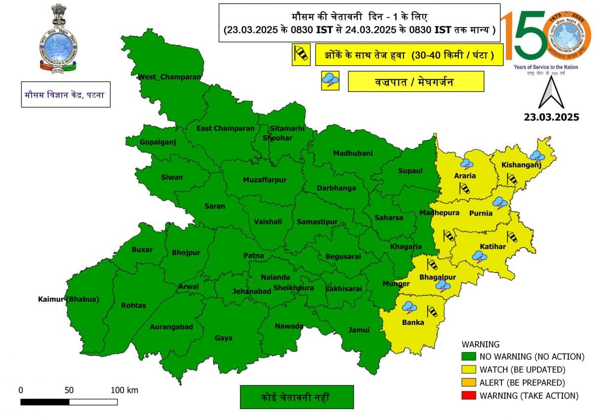 Bihar Weather: बिहार को लेकर जारी किये पूर्वानुमान में पटना मौसम विज्ञान केंद्र ने बताया कि 23 से 24 मार्च तक प्रदेश के 6 जिलों में मेघगर्जन, वज्रपात और बारिश की संभावना है.