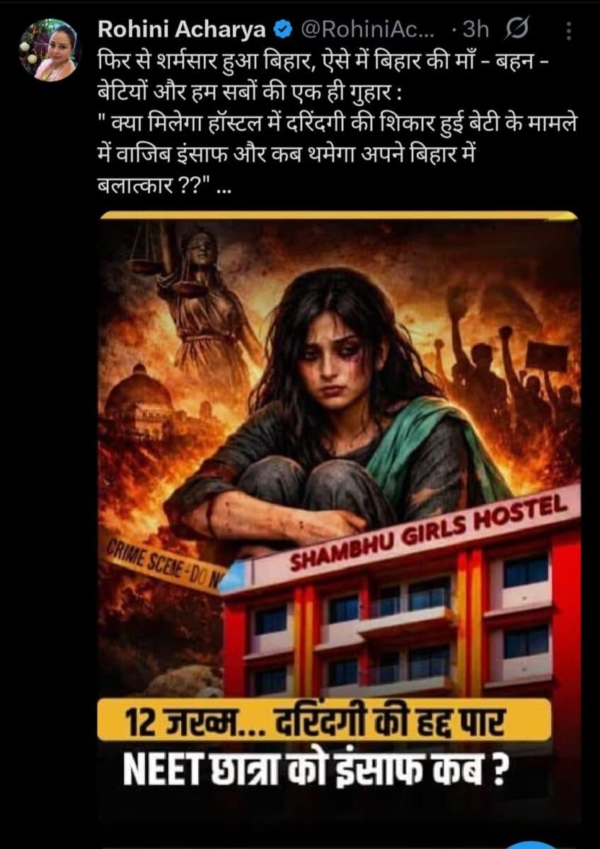 वहीं, रोहिणी ने सोशल मीडिया पर सवाल उठाया है. उन्होंने पूछा है कि NEET की छात्रा दरिंदगी की शिकार हुई, उसे इंसाफ कब मिलेगा. उनका कहना है कि यह मामला सिर्फ एक मौत का नहीं, बल्कि सिस्टम की नाकामी का है.