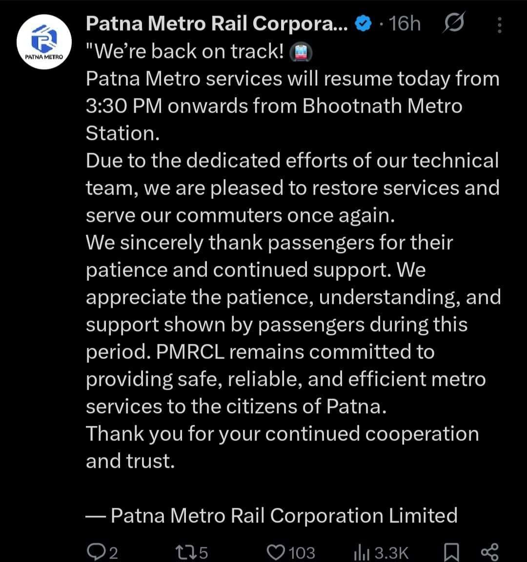 Patna Metro: तकनीकी खराबी दूर, 18 घंटे बाद पटरी पर लौटी पटना मेट्रो, यात्रियों ने किया सफर