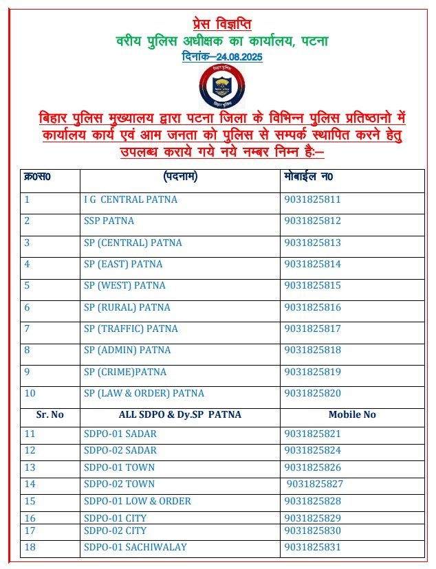 पुलिस मुख्यालय की ओर से जारी की गई जानकारी के अनुसार, पटना जिले के सभी DSP और SDPO के मोबाइल नंबर भी बदल दिए गए हैं. इसका मकसद यह है कि लोग अपनी समस्या सीधे संबंधित पदाधिकारी तक पहुंचा सकें और शिकायतों के निपटारे में तेजी आए.