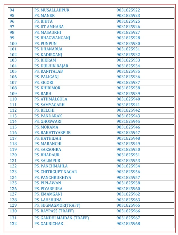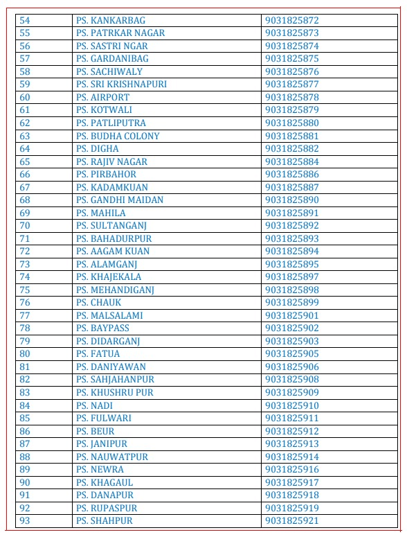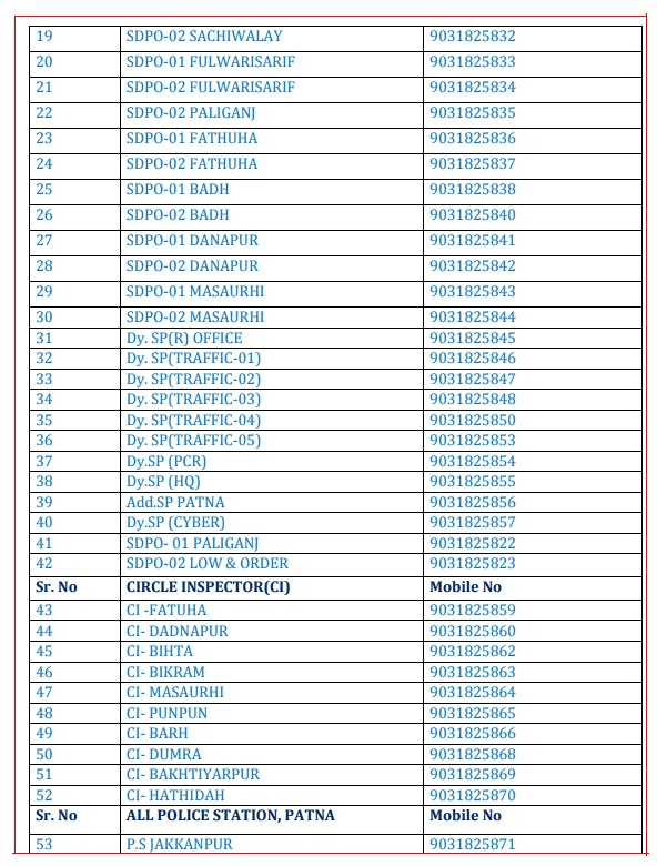 नई व्यवस्था के तहत पटना जिले के सभी सर्किल इंस्पेक्टर और थानेदार (SHO) को भी नए मोबाइल नंबर जारी किए गए हैं. इसका मतलब है कि अब किसी भी थाना क्षेत्र का व्यक्ति अपने थानेदार को नए आधिकारिक नंबर पर सीधे कॉल कर सकता है.