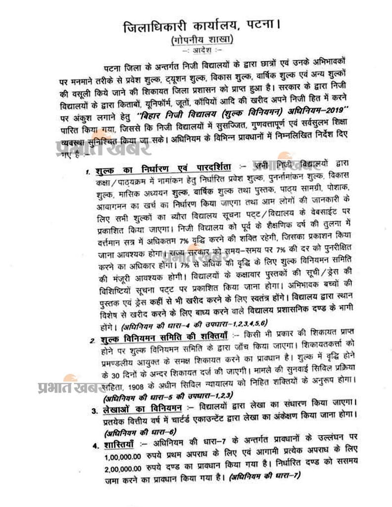 Patna Private School News: पटना में प्राइवेट स्कूलों की मनमानी फीस वसूली पर अब प्रशासन सख्त हो गया है. जिलाधिकारी ने साफ निर्देश दिया है कि बिना अनुमति कोई भी स्कूल अतिरिक्त शुल्क नहीं ले सकेगा और नियम तोड़ने वालों पर कड़ी कार्रवाई की जाएगी.