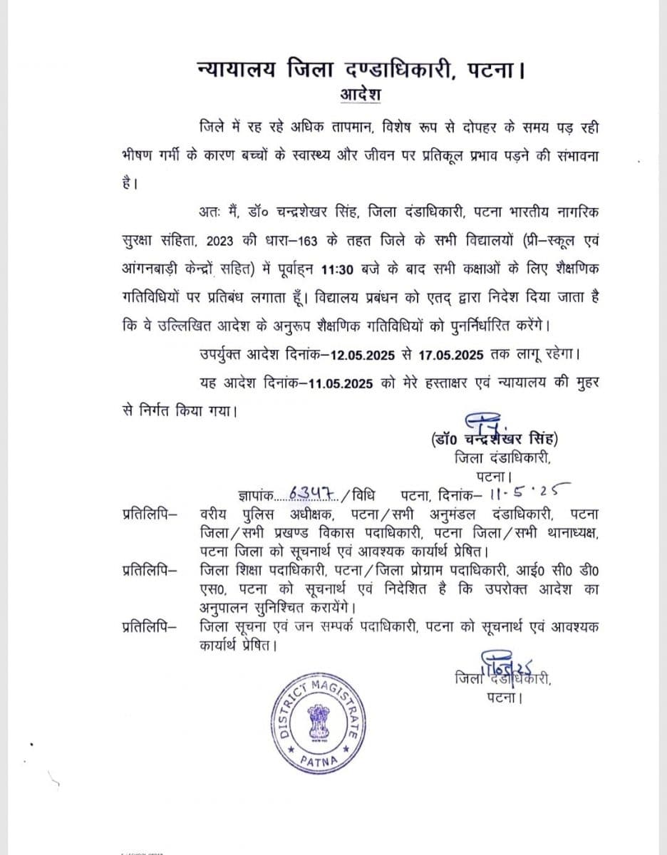 यह आदेश 12 मई 2025 से प्रभावी होगा और 17 मई 2025 तक लागू रहेगा. इस दौरान किसी भी विद्यालय में 11:30 बजे के बाद कक्षाएं नहीं चलाई जाएंगी. पटना डीएम डॉ. चंद्रशेखर सिंह द्वारा यह आदेश भारतीय नागरिक सुरक्षा संहिता 2023 की धारा 163 के अंतर्गत जारी किया गया है.