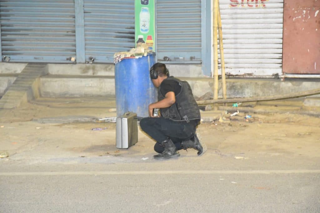 एटीएस व पटना पुलिस के बम स्कवॉयड व डॉग स्कवॉयड ने जांच की फिर बालू के बोरे से सूटकेस के चारों ओर घेराबंदी कर दी गयी.