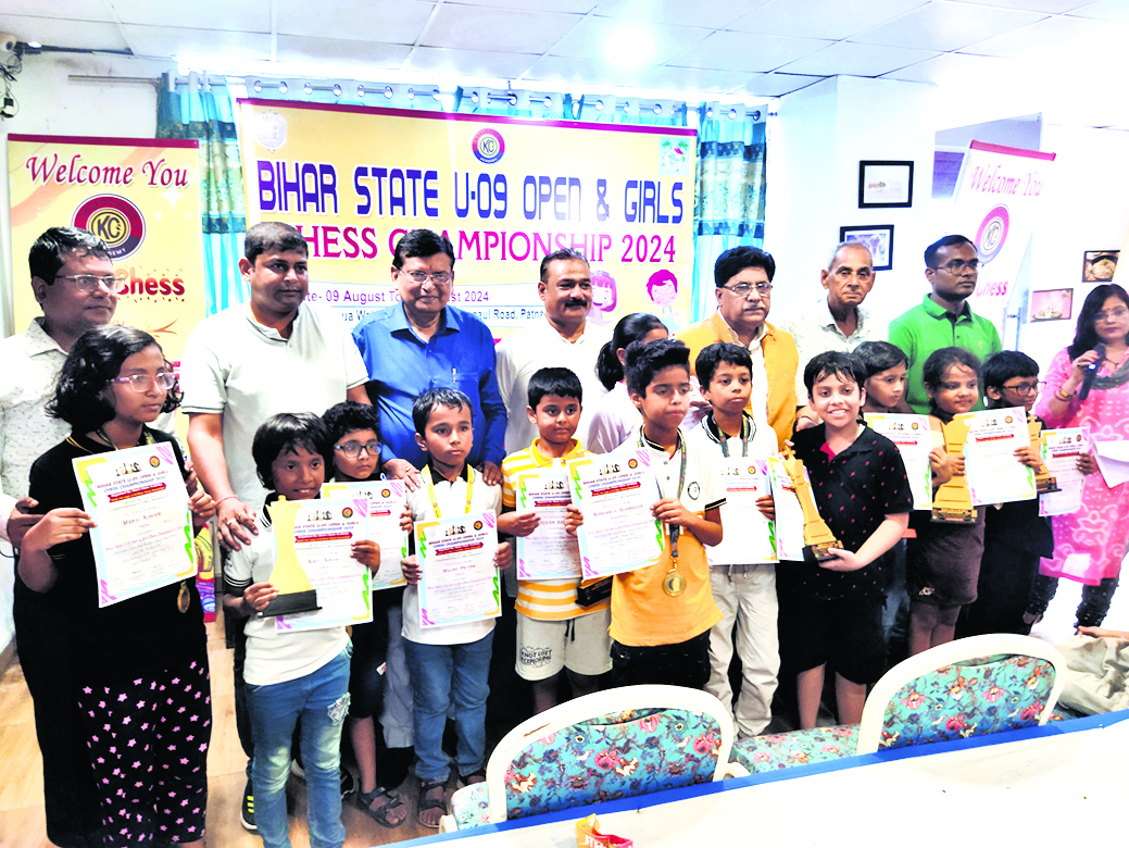 पटना. अखिल बिहार शतरंज संघ के तत्वावधान में खेलो चेस एकेडमी द्वारा सगुना मोड़ स्थित एक्वा वाटर पार्क में आयोजित बिहार राज्य अंडर-9 शतरंज प्रतियोगिता का रविवार को समापन हुआ. बालक वर्ग में मुजफ्फरपुर के युवान रमन और बालिका वर्ग में पटना की अंकिता राज ने विजेता का खिताब जीता. बालक वर्ग के अंतिम चक्र में मुजफ्फरपुर के युवान ने बोर्ड नंबर एक पर पटना के आकर्ष आनंद को जबकि बोर्ड नंबर दो पर पटना के देवांश केशरी ने नालंदा के यशु यशश्वी को पराजित कर क्रमशः विजेता और उपविजेता का खिताब जीत लिया. वहीं, साढ़े पांच अंकों के साथ मुजफ्फरपुर के अभिराज कुमार अरुनव तीसरे स्थान पर रहे. बालिका वर्ग में एक बार फिर अंकिता ने अपना जलवा दिखाते हुए प्रतियोगिता की विजेता बनी. शीर्ष बोर्ड पर हुए रोमांचक मुकाबले में अंकिता ने काले मोहरों से खेलते हुए तृषा रंजन को पराजित कर खिताब अपने नाम किया. शीर्ष बोर्ड के परिणाम के आधार पर चार अंकों के साथ रही तृषा उपविजेता घोषित हुई. चार अंकों के साथ कीर्ति सिन्हा और राजश्री टाई ब्रेक अंकों के आधार पर क्रमशः तीसरे व चौथे स्थान पर रही. अखिल बिहार शतरंज संघ के अध्यक्ष दिलजीत खन्ना, सचिव धर्मेंद्र कुमार, पूर्व सचिव अजित कुमार सिंह, रोटरी क्लब ऑफ पटना के पूर्व अध्यक्ष और जाने-माने समाजसेवी राजेश अग्रवाल, प्रबल कुमार सिंह, गया जिले के पुलिस उपाधीक्षक महताब आलम और दानापुर जीएसटी के संयुक्त आयुक्त गंगा प्रसाद ने विजेता खिलाड़ियों को ट्राॅफी, मेडल और सम्मान पत्र देकर सम्मानित किया. इस अवसर पर अखिल बिहार शतरंज संघ के कोषाध्यक्ष मनीष कुमार, संयुक्त सचिव नन्दकिशोर, शिवप्रिय भारद्वाज, हिमांशु कुमार, प्रतियोगिता की आयोजन सचिव नेहा सिंह, प्रतियोगिता निदेशक आशीष राज, वरीय शतरंज खिलाड़ी विनय कुमार, सुधीर कुमार सिन्हा, मिन्हाजुल होदा, विजय कुमार कुमार मौजूद रहे.